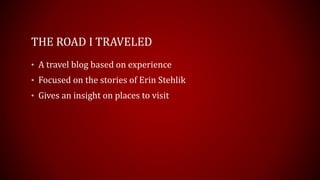 Erin Stehlik's travel blog focuses on sharing stories from her trips to give readers insights into places to visit. The blog has pages that explain her background and travel experiences. It aims to entertain readers and provide recommendations for potential travelers and her family. In initial posts, she wrote about trips to New Hampshire, Muskegon Michigan, and Connecticut, describing sights, activities, food and humorous experiences to convey each location. She concludes the blog is succeeding at storytelling and plans to continue chronicling her travels.