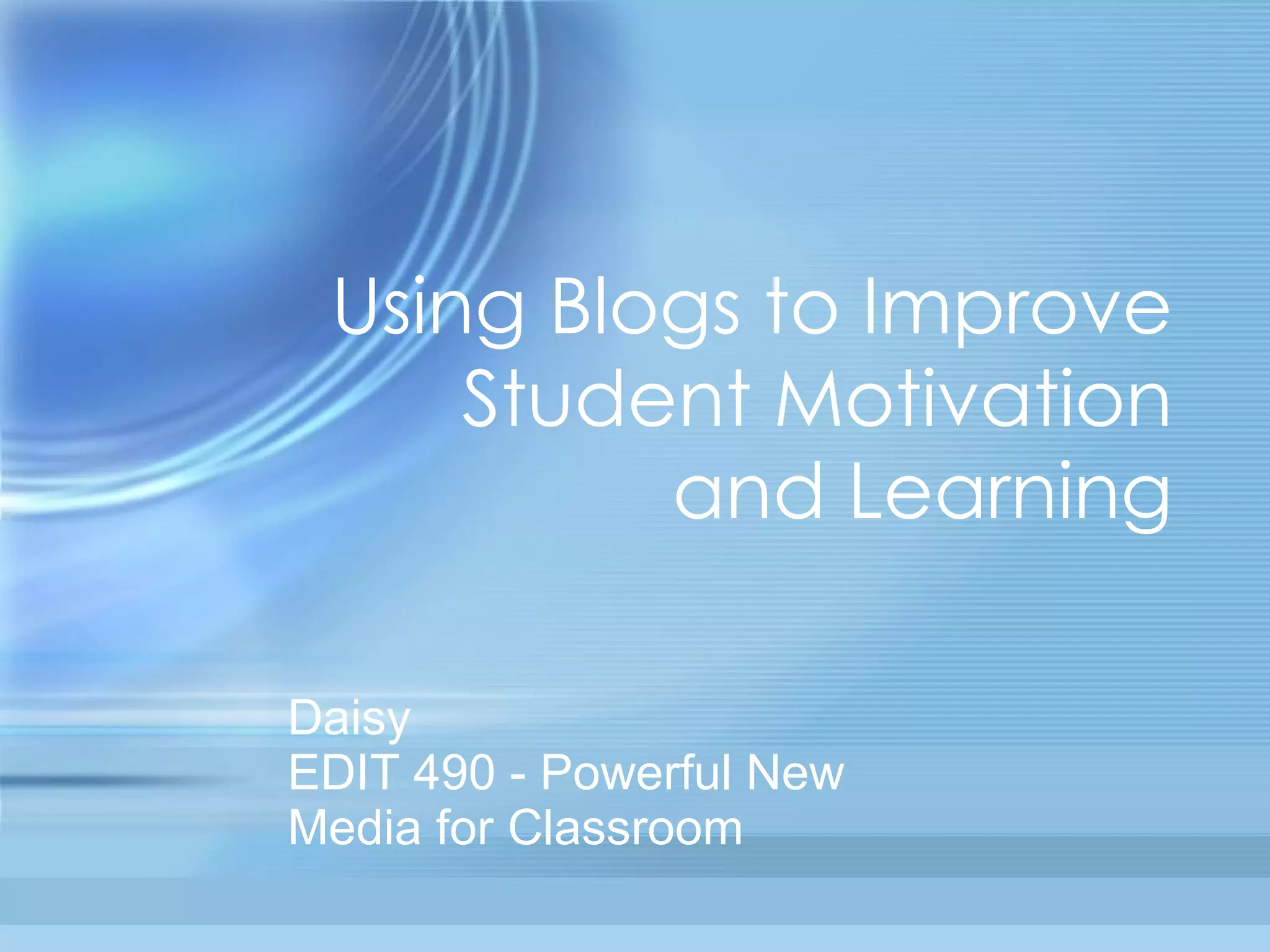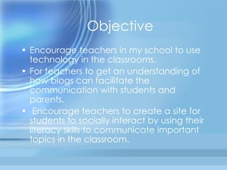 The document discusses using blogs in the classroom to improve student motivation and learning. It recommends that teachers create classroom blogs to better communicate with students and parents, allow students to socially interact using literacy skills, and discuss important topics. Setting up a blog through Blogger.com is simple and allows teachers to post assignments, notes, and resources to keep students updated and engaged in learning. Blogs support collaboration between students and help improve communication, motivation, and excitement for learning.