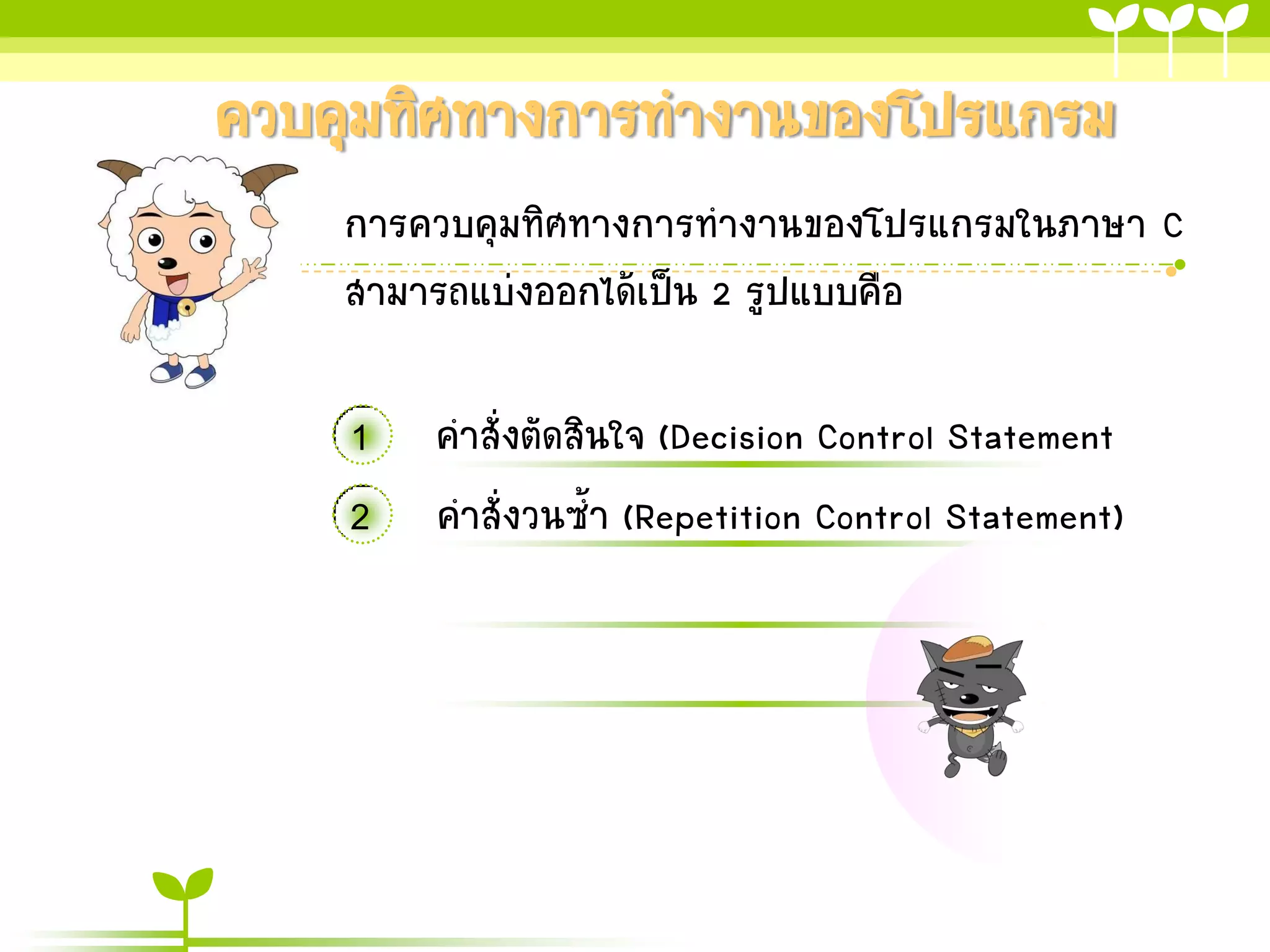การควบคุมทิศทางการทางานของโปรแกรมในภาษา C สามารถแบ่งออกได้เป็น 2 รูปแบบคือ 1 คาสั่งตัดสินใจ (Decision Control Statement 2 คาสั่งวนซ้า (Repetition Control Statement)