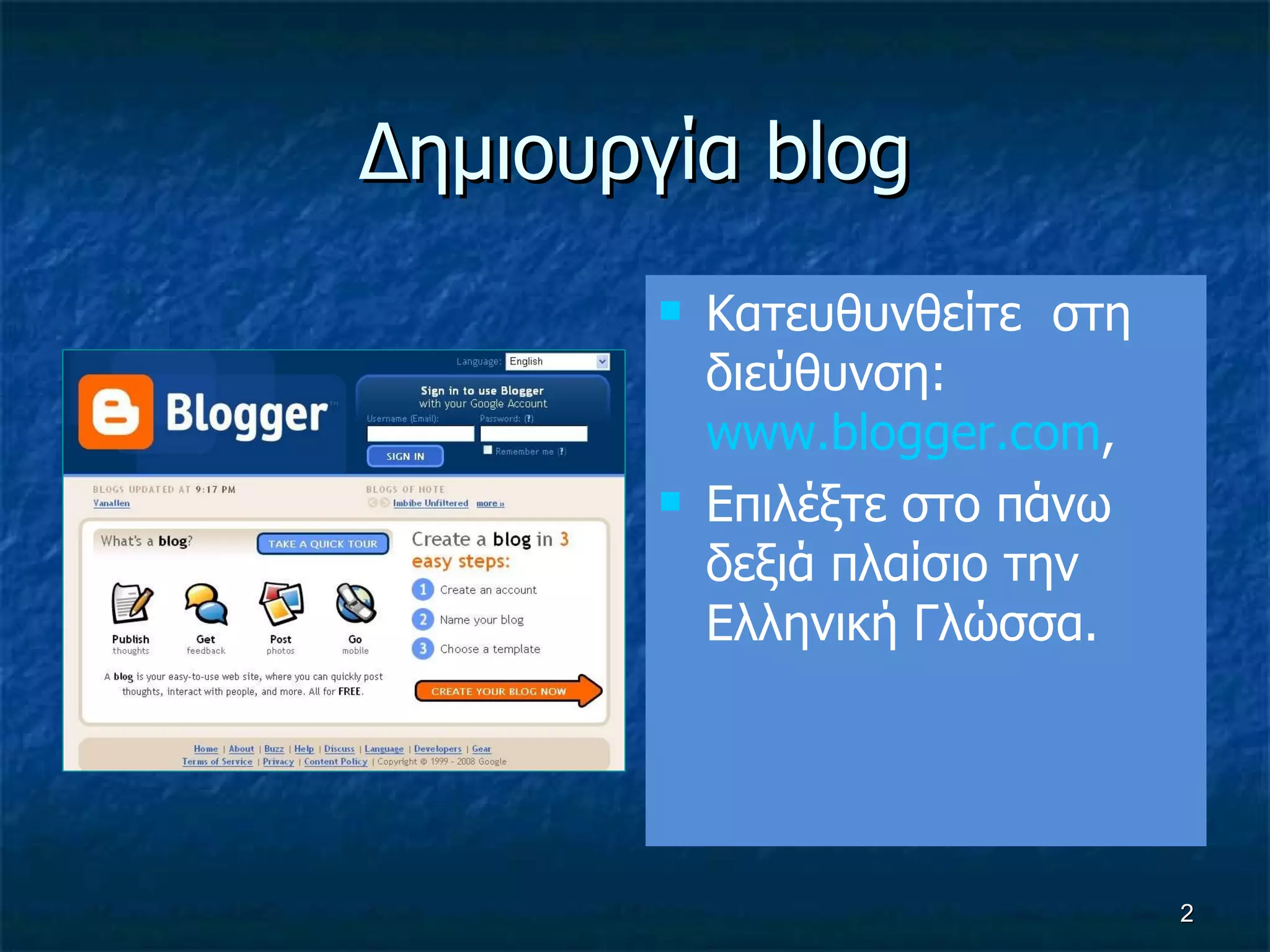 Δημιουργία blogΚατευθυνθείτε στη διεύθυνση: www.blogger.com , Επιλέξτε στο πάνω δεξιά πλαίσιο την Ελληνική Γλώσσα.