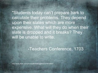 Over the past 300 years, educators have consistently expressed concern that students rely too heavily on new technologies for writing and calculation. Early educators worried that students could not write without slate or make their own ink. Later critics argued students did not know how to sharpen pencils or write with quill pens. In the 20th century, concerns shifted to ballpoint pens, handheld calculators, and eventually computers. However, technologies that were once seen as luxuries or detrimental to learning are now commonly used in modern education.