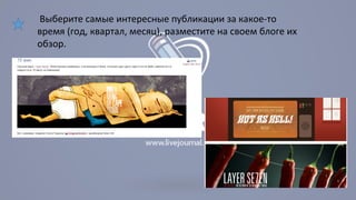 Документ представляет собой анализ блога популярного российского блогера Дмитрия Чернышева (mi3ch) в контексте рекомендаций для интернет-маркетинга. В нем указано, что блогер не использует многие распространенные методы, такие как проведение вебинаров или размещение видеороликов, и в основном делится личными размышлениями без специальных акций или конкурсов. Также отмечается, что содержание блога не соответствует многим советам по ведению успешного интернет-маркетинга.