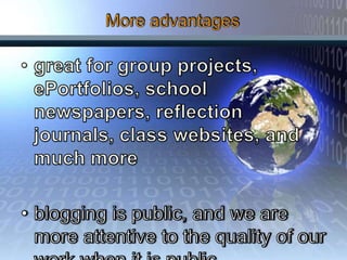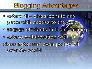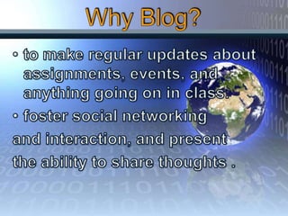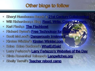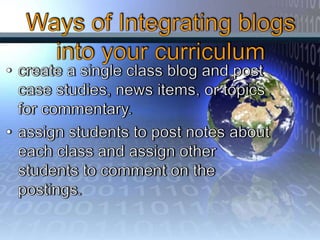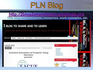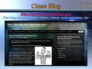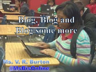 This document provides information about working with blogs, including a blog site called "2blog2share2learn" located at http://2blog2share2learn.edublogs.org/, a presentations site at http://msbisonline.weebly.com/, an eCard profile at http://about.me/VRBurton, and mentions creating your own blog site and posting information to it.