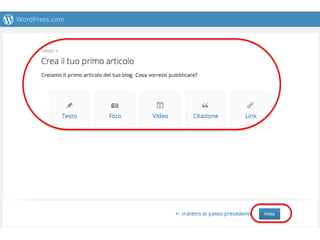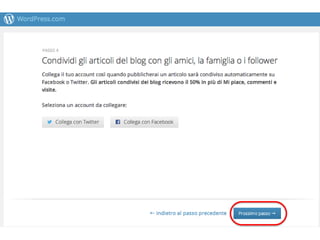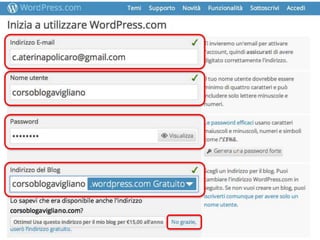 Il documento offre una guida su come utilizzare WordPress, inclusa la registrazione, la scelta di temi gratuiti e l'accesso alla bacheca. Descrive i primi passi per la creazione di un blog e le opzioni per scrivere post di vario tipo. Inoltre, consiglia di seguire altri blog per ampliarne la rete.
