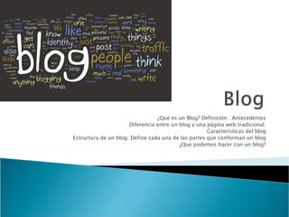 Este documento define un blog, explica sus características y estructura. Un blog es un sitio web actualizado periódicamente que recopila artículos de uno o más autores en orden cronológico. Se diferencia de una página web en que fomenta más la interacción. Un blog típicamente clasifica información por fecha, categorías y etiquetas. Los blogs permiten comentarios de lectores y su contenido puede tener funciones documentales, comunicativas o constructivas.