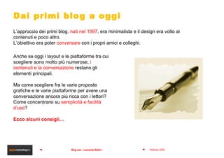 Il documento analizza l'evoluzione del design dei blog, evidenziando l'importanza dei contenuti e della conversazione. Vengono descritti elementi essenziali come layout, meta informazioni, gestione dei commenti e l'uso dei link, nonché sugli aspetti tecnici per migliorare l'interazione con i lettori. Infine, si discutono le varie opzioni di layout e font per ottimizzare l'esperienza dell'utente.