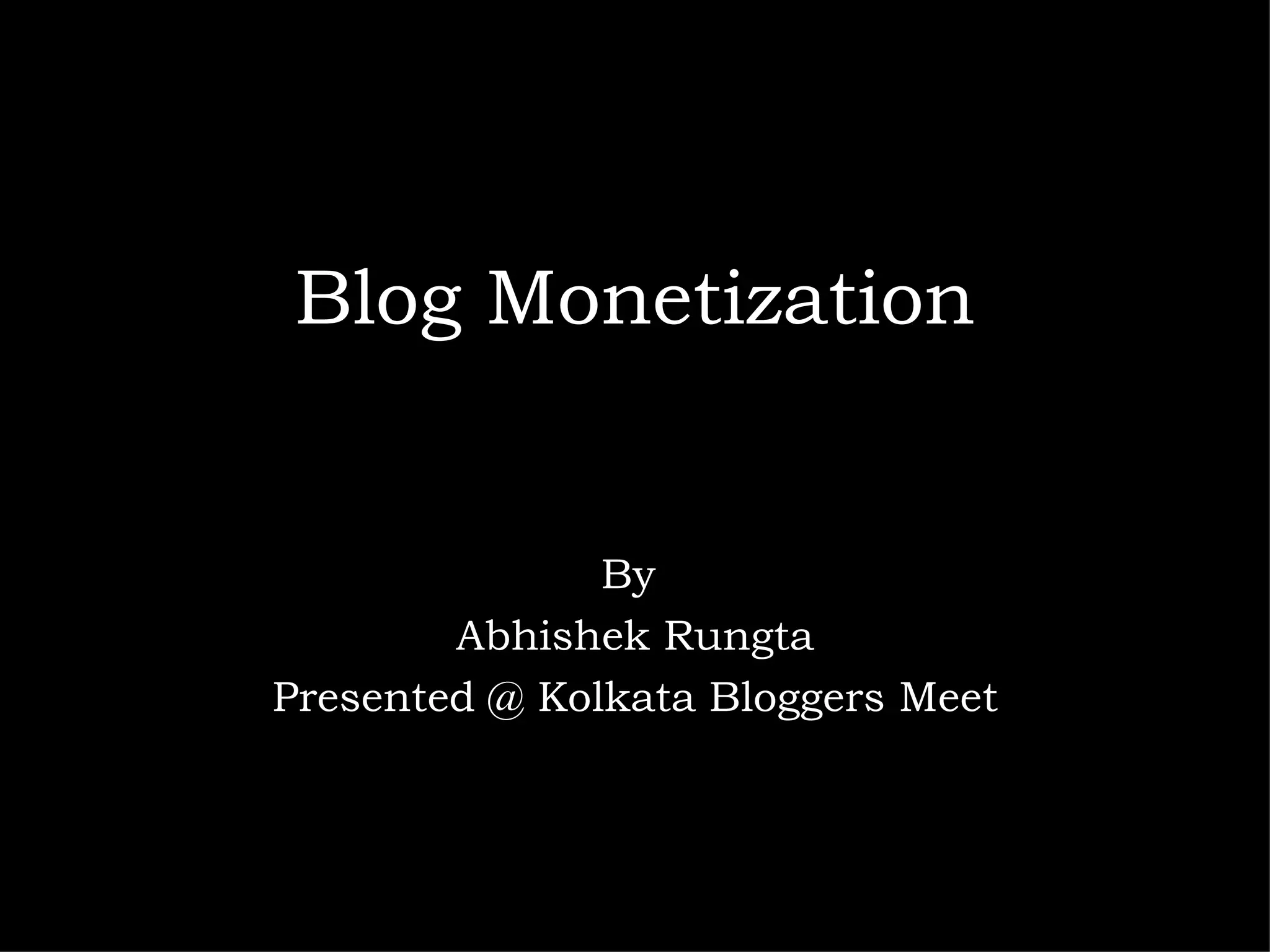 The document discusses various aspects of blog monetization presented by Abhishek Rungta at the Kolkata Bloggers Meet, emphasizing that monetary gain should be a by-product of pursuing one's passion for blogging. It highlights the importance of authentic communication, building reputation, and engaging with audiences, both as individuals and companies. Additionally, it covers methods for monetization such as sponsored reviews, advertising, affiliate programs, and guest blogging.