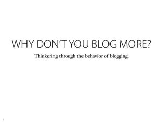 The document discusses reasons why more people don't blog more often. It notes that while most people say they want a successful blog, very few actually blog on a regular basis. The document considers some common objections to blogging, such as it taking too much time, and argues people have surplus cognitive time from watching TV that could be used for blogging instead. It aims to have an engaged discussion about what makes blogging easy versus difficult and behaviors around blogging.