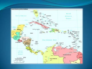 This document provides an overview of the geography, history, culture, and economies of Central America and the Caribbean islands. It describes Central America as a narrow isthmus connecting North and South America that contains 7 countries, while the Caribbean islands are comprised of hundreds of islands divided into three main groups. The region has a tropical climate and was colonized by Europeans starting in the 1500s. Today, the countries have similar histories but diverse economies, with many relying on agriculture, tourism, and foreign investment.
