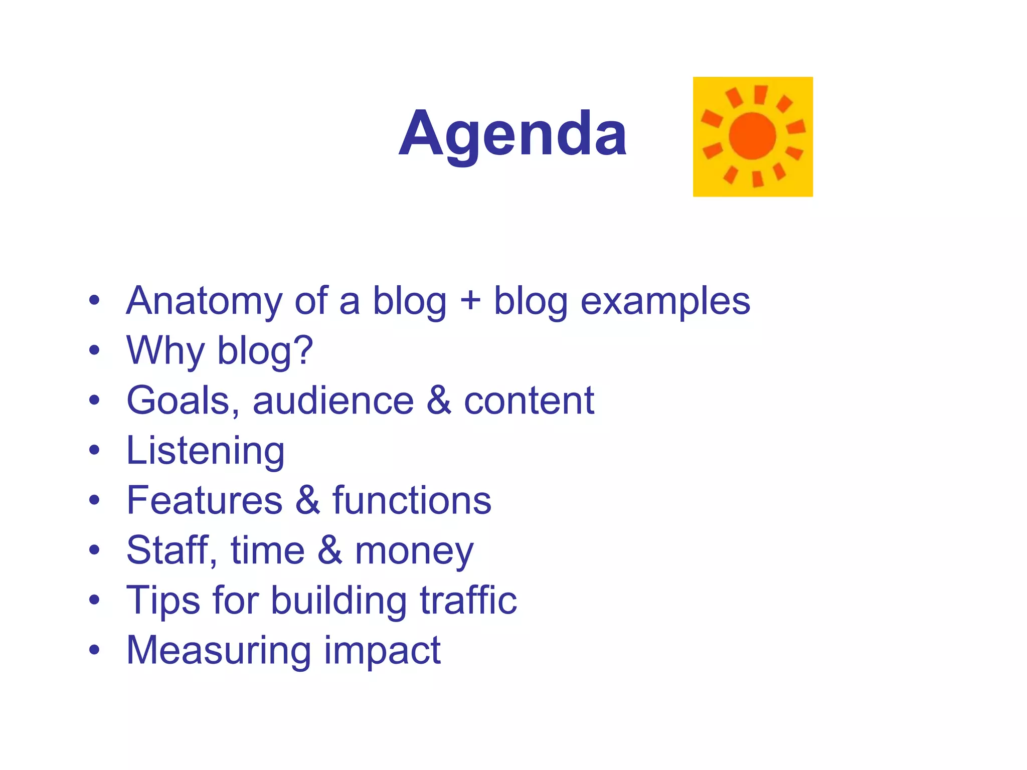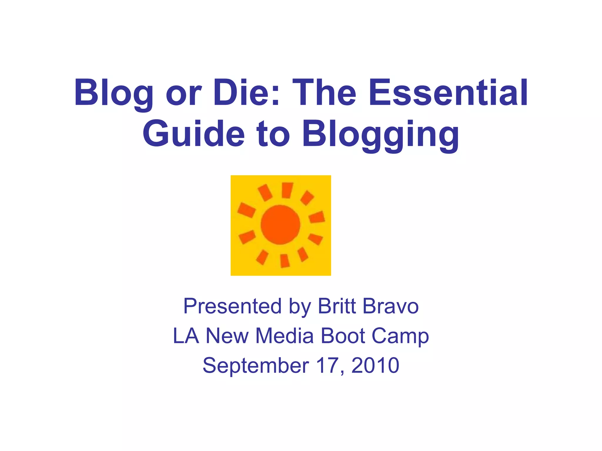 The document is a guide to blogging presented by Britt Bravo, covering essential aspects like the anatomy of a blog, audience targeting, content creation, and techniques for increasing traffic. It provides practical tips on achieving blogging goals, measuring impact, and various blogging platforms and tools. Additionally, the guide includes examples of blog topics, listening tools, and resources for nonprofits to effectively engage their audience.