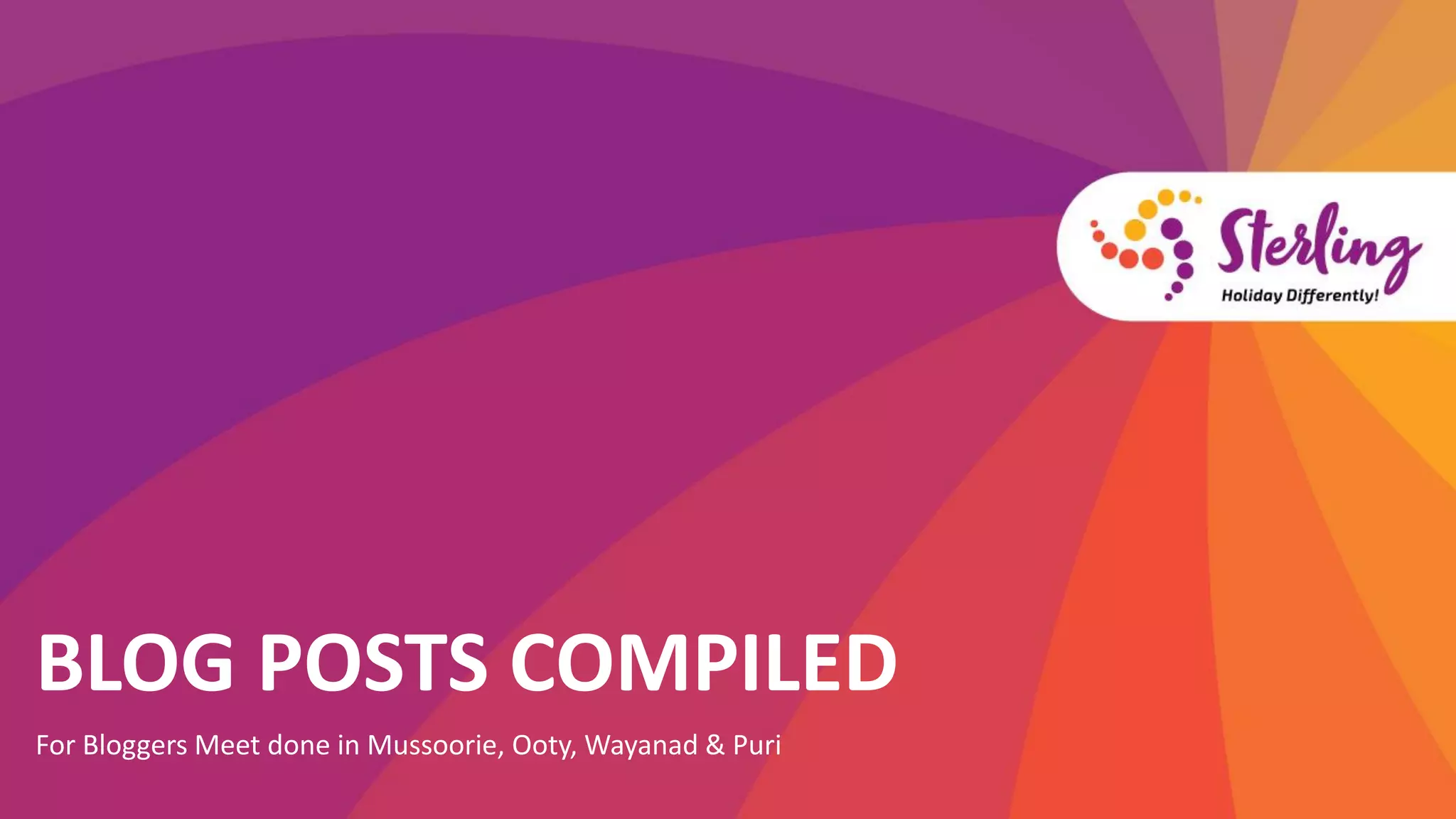 The document summarizes blog posts written by various bloggers after attending bloggers meets organized by Sterling Resorts in 4 locations - Mussoorie, Ooty, Wayanad, and Puri. It provides details of the number of bloggers meets (4) held in July-August 2018 and total number of participating bloggers (64). It also lists the key topics covered by the bloggers - travel, lifestyle, food, and fashion. The cumulative social media reach of the bloggers is provided as 1.2 million on Instagram, 2.2 lakh on Facebook, and 50k on Twitter. The rest of the document consists of individual blog posts written by each blogger after attending the meets.