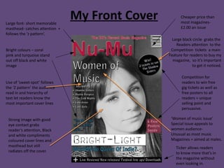 The magazine uses bright colors, large fonts, and eye-catching images and design elements to attract readers' attention on the cover. A low price point and unique competition offering free concert tickets and posters provides value and incentive for readers to purchase the magazine. The cover highlights a special "Women of Music" issue to appeal to a wider audience than just males.