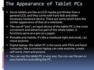 Tablet PCs are portable computers that use a touchscreen as their primary input. They run standard PC operating systems and can be used like laptops with the added benefit of pen or touch input. Tablet PCs are being used increasingly in education due to their low cost, mobile form factor, and touch interface compared to laptops. They are also being used more in healthcare for patient education, rehabilitation, and pharmaceutical applications. Popular tablet PCs available in India include the Apple iPad, HP Slate, Dell Streak, Samsung Tab, Asus EEE Tablet, and a $35 tablet from an Indian company.