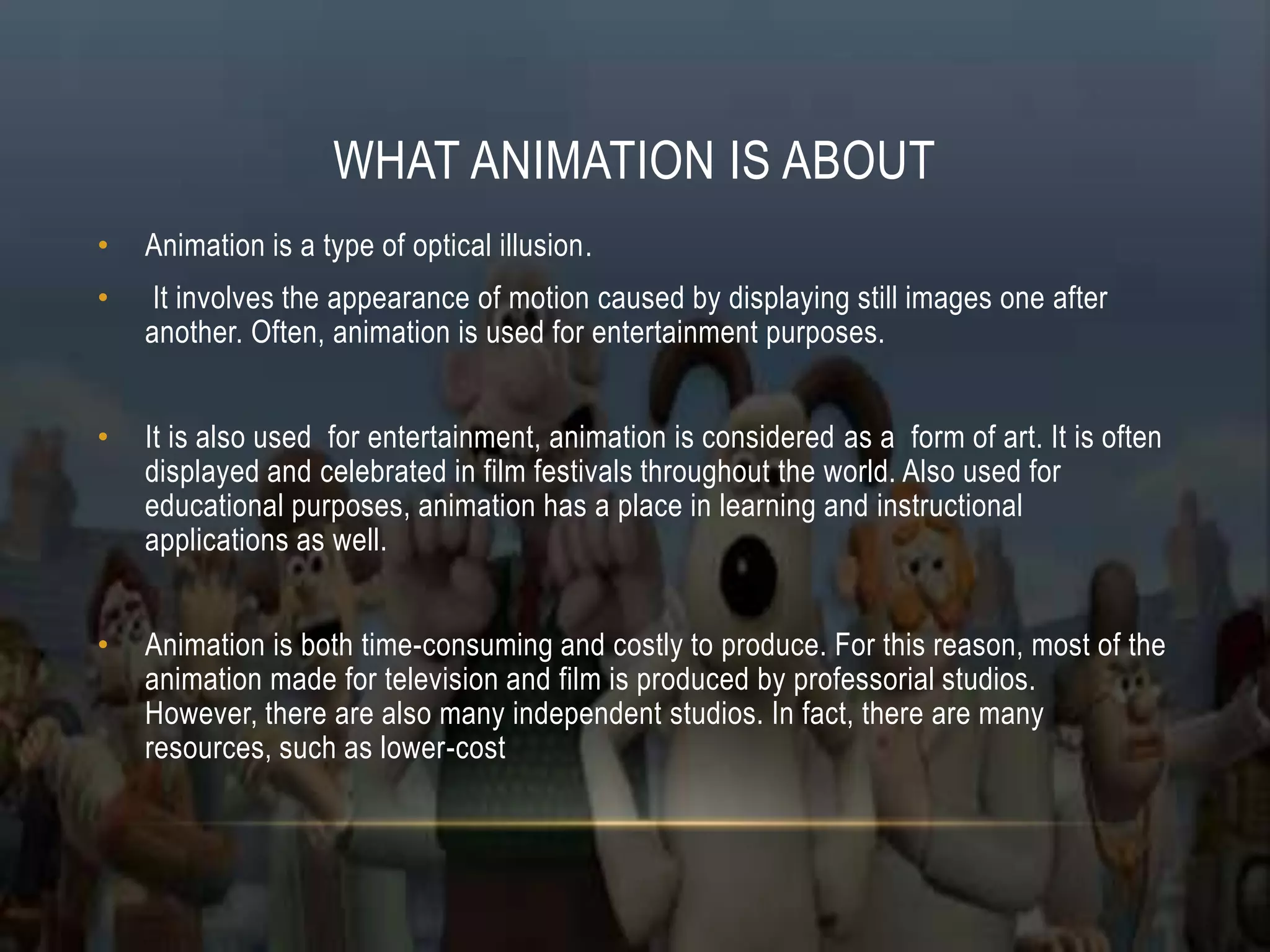 Stop motion animation techniques involve sculpting objects from materials like clay or plasticine and photographing small movements between frames to create the illusion of motion. Clay animation is extremely laborious, requiring 12 changes per second of footage. Cutout animation uses flat characters and props cut from materials like paper. Stop motion broadly refers to animating real-world objects by manipulating them frame by frame. Early pioneers like Muybridge captured motion through sequential photography, while Harryhausen and Svankmajer are known for creative stop motion films. Contemporary animators like Tim Burton and Aardman Animations continue stop motion traditions.