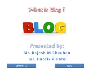 A blog is a series of entries or posts created by an individual and stored chronologically that allows readers to comment. Blogs are found on the internet and allow users to share information either personally or professionally. Examples include blogs by journalists expressing opinions, businesses using blogs for advertising, and government entities using blogs to share events. Creating a blog takes only a few minutes by signing up on blogger.com, naming the blog, and choosing a template.