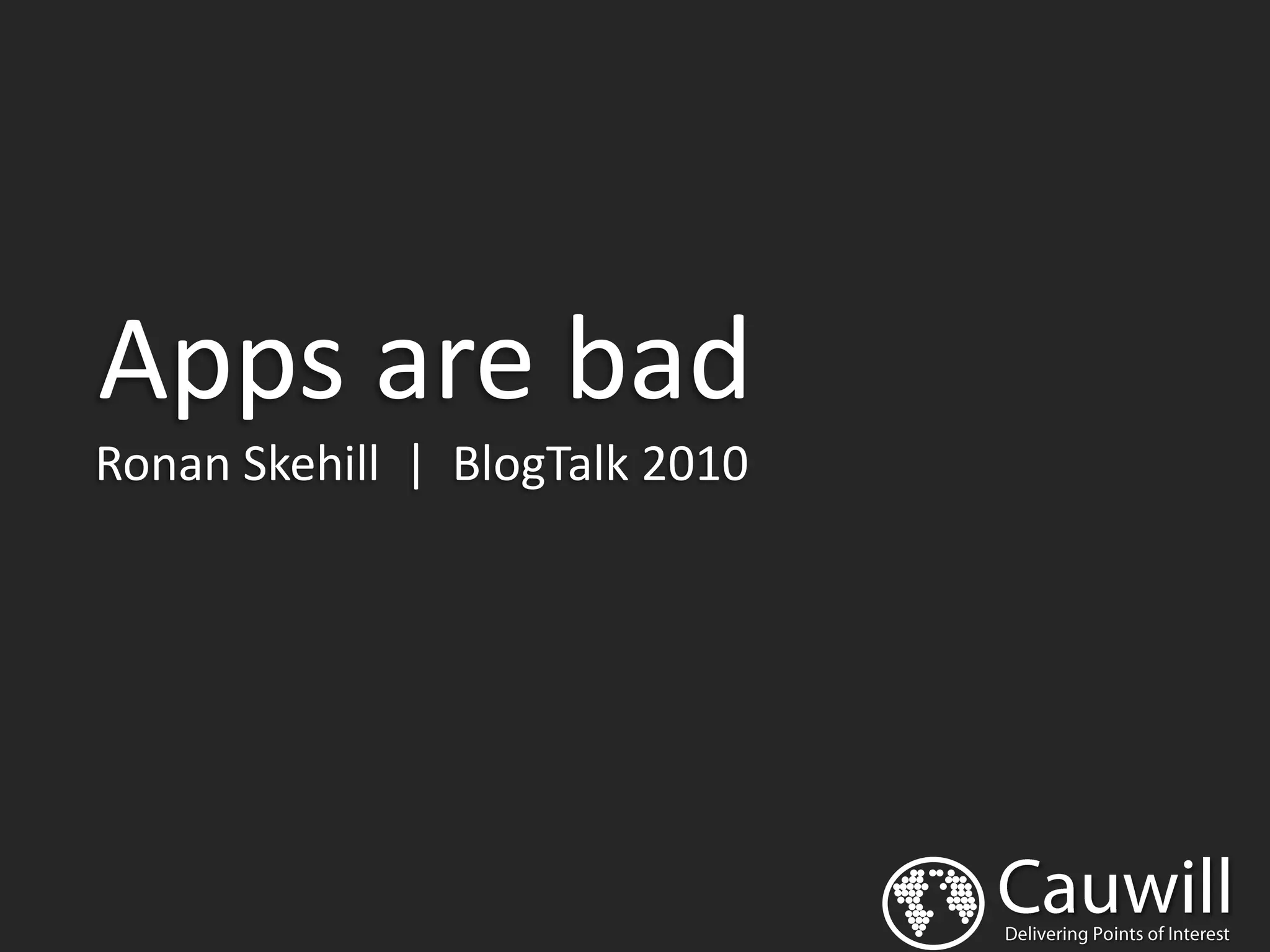 This document summarizes Ronan Skehill's presentation on apps. It begins with smartphone statistics showing rapid growth. It then discusses the many app stores and platforms. A decision matrix compares native apps to web apps on various factors like user experience, monetization, and technical capabilities. While web apps are cheaper and easier to build, native apps generally provide a better user experience and ability to utilize device features. The conclusion is that this presentation provided smartphone statistics, discussed app distribution options, and presented a guide to decide whether an app should be native or web-based.