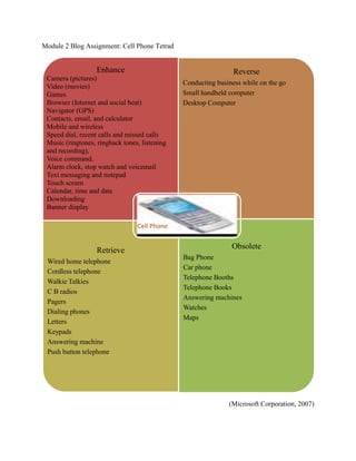 The document discusses the evolution of cell phones from their inception to modern smartphones. It describes how cell phones have replaced technologies like pay phones, maps, and palm pilots by providing communication and computing capabilities in a small, portable device. The cell phone has advanced rapidly over the years, adding features like cameras, internet access, apps, and more. In the future, cell phones may fully replace desktop computers by allowing users to conduct all business and tasks remotely. The cell phone can be seen as updating past technologies like corded phones, walkie talkies, and pagers by integrating their functions into a single, wireless device.