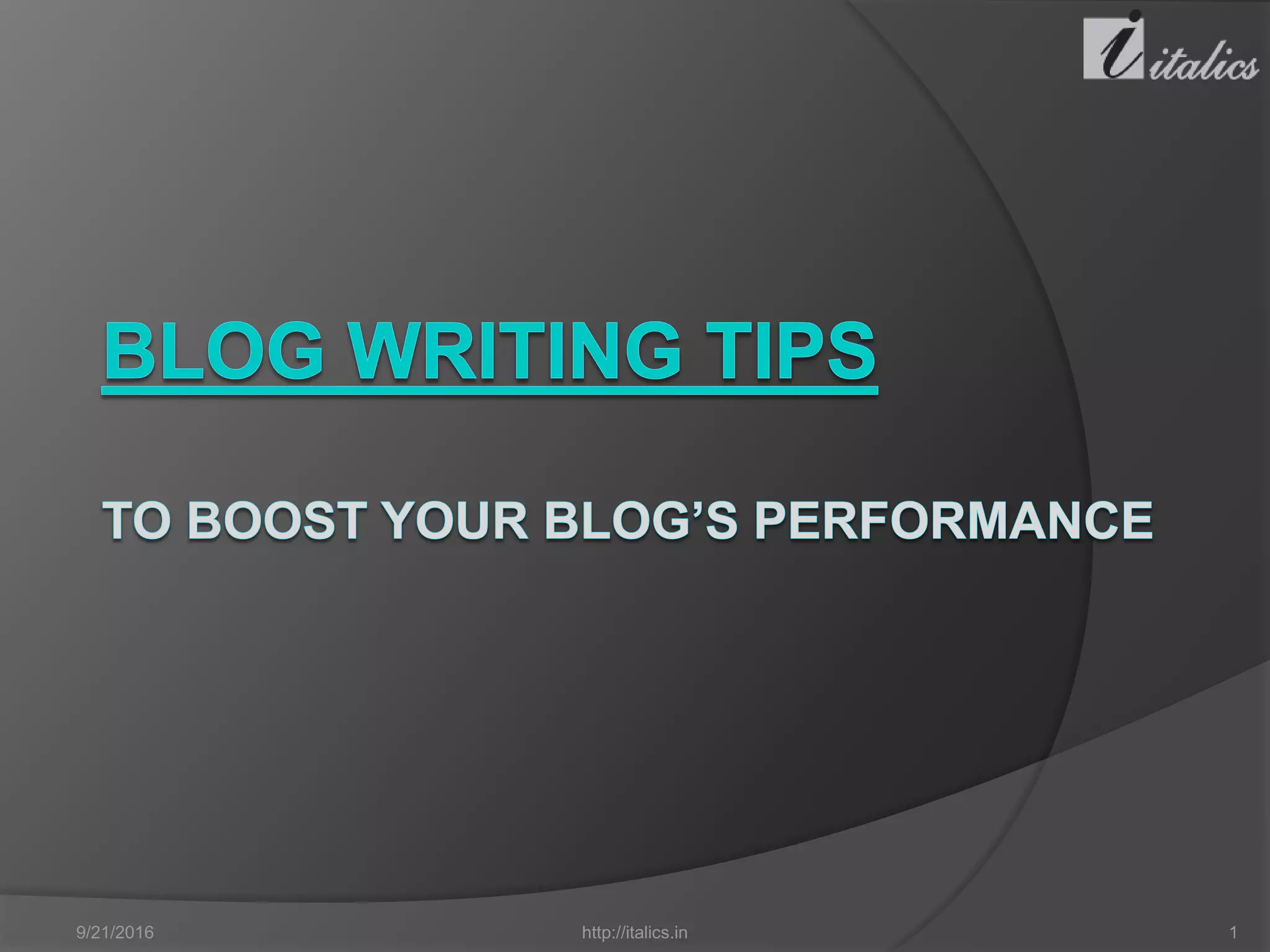 The document discusses blogging and provides tips for business blogging. It explains that blogging allows one to share their thoughts and opinions with others on the internet. It has become an important marketing tool for businesses to share information with potential customers. The document then provides several tips for business blogging, such as writing about topics related to your business and using blogging to increase the visibility of your website and search engine rankings. Finally, it recommends performing thorough analysis of your competition and having a sound strategy before launching a business blog.