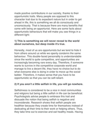 The document discusses the concept of opportunism and argues that it is a trait that is necessary for success. While opportunism is often viewed negatively, the document provides several reasons why exhibiting opportunistic behaviors can be beneficial. It states that most people are opportunistic to some degree but do not openly admit it. Furthermore, opportunism allows individuals to experience more in life, gain valuable experience from different opportunities, and achieve their goals.