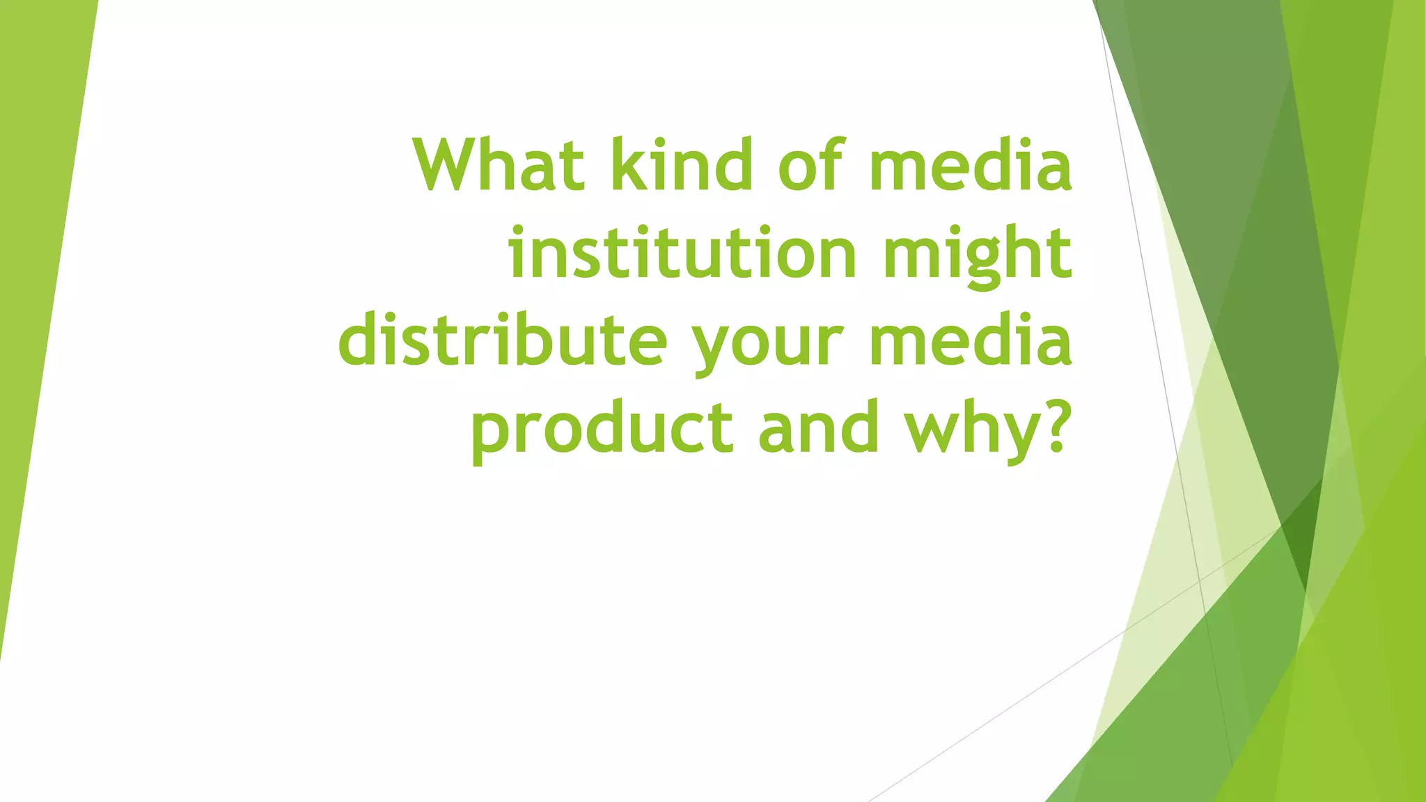 A film distributor is responsible for marketing and distributing a film. They set the release date and choose how the film will be exhibited or made available for viewing, such as in cinemas or on DVD. Multinational distributors have larger budgets to distribute and promote films nationally or worldwide, while independent distributors have limited local promotion budgets. Left Films and Hammer Films are suggested as potential distributors for the filmmaker's slasher film because they specialize in low-budget horror and thriller genres. Film4 Productions is also proposed as they have successfully distributed similar films without any current competing titles.