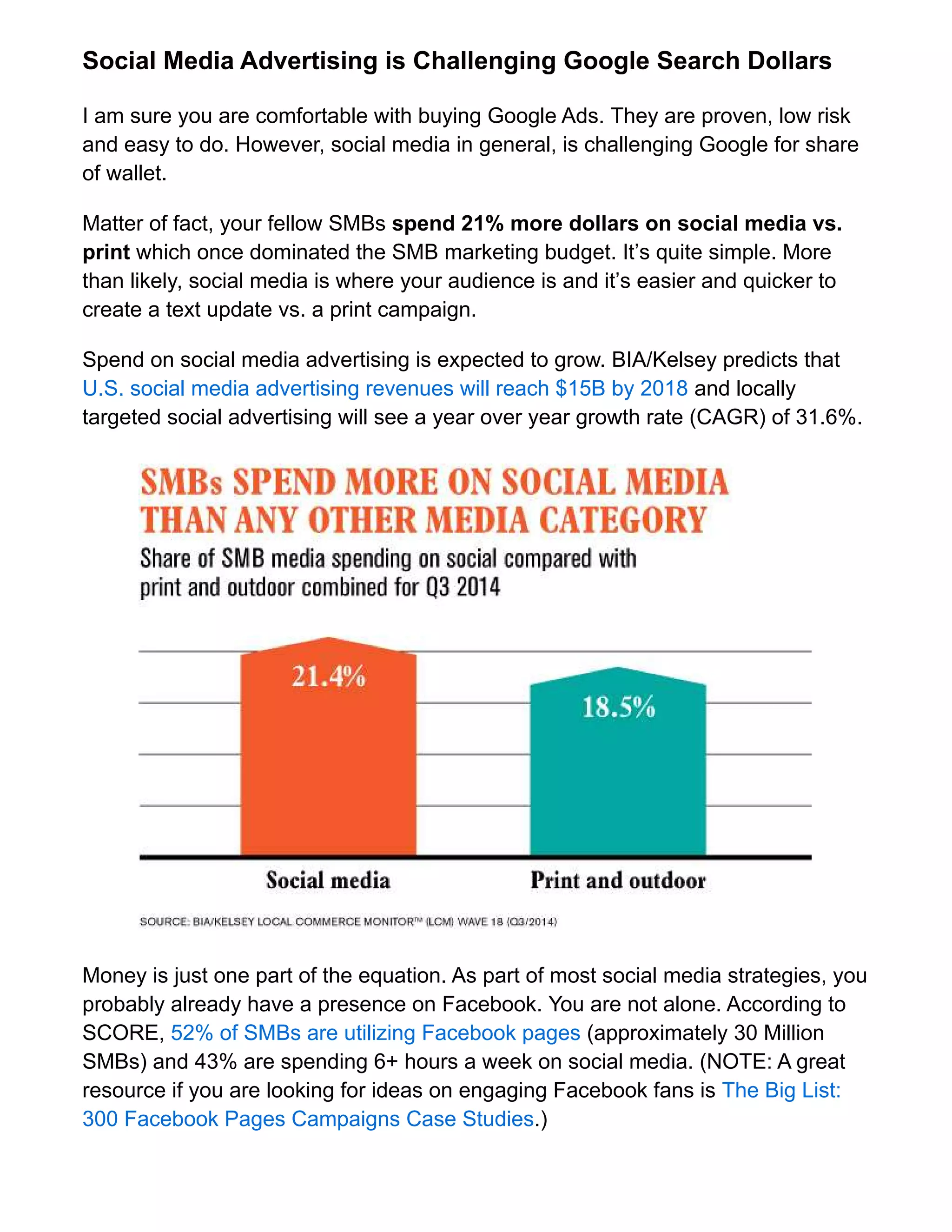 The document discusses the increasing adoption of Facebook advertising by small and medium-sized businesses (SMBs) as a cost-effective method for customer growth, positioning Facebook as a competitor to Google in the SMB advertising market. It highlights the shift in advertising budgets from print to social media, with expectations of significant growth in social media ad revenues. Additionally, the document offers insights into best practices for initiating Facebook advertising campaigns and shares links to successful case studies that demonstrate its effectiveness.