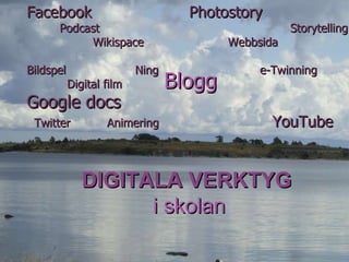 Facebook Photostory Podcast Storytelling Wikispace Webbsida Bildspel Ning e-Twinning Digital film Google docs Twitter Animering YouTube Blogg DIGITALA VERKTYG i skolan