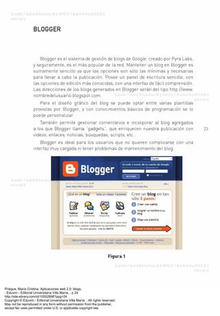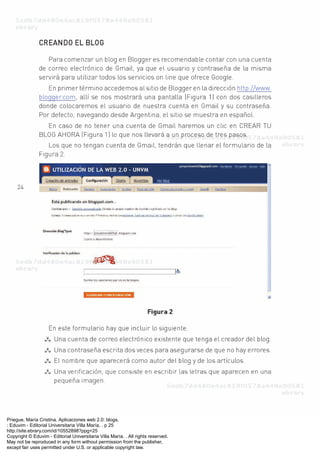 The document consists of pages 24 through 37 from the book "Aplicaciones web 2.0: blogs" by María Cristina Priegue. Each page contains copyright information stating it cannot be reproduced without permission from the publisher Eduvim - Editorial Universitaria Villa María.