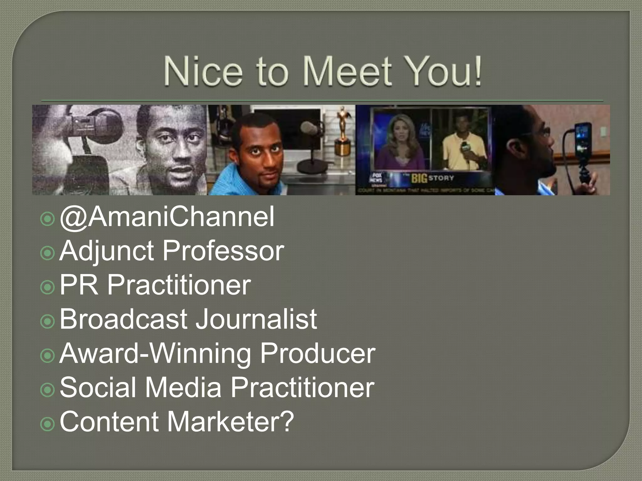 Amani Channel is a multifaceted professional including roles as an adjunct professor, PR practitioner, journalist, and content marketer. He emphasizes the importance of digital marketing and offers services related to content strategy, video production, and training. The document outlines various ways to monetize digital presence, engage with audiences, and leverage social media.