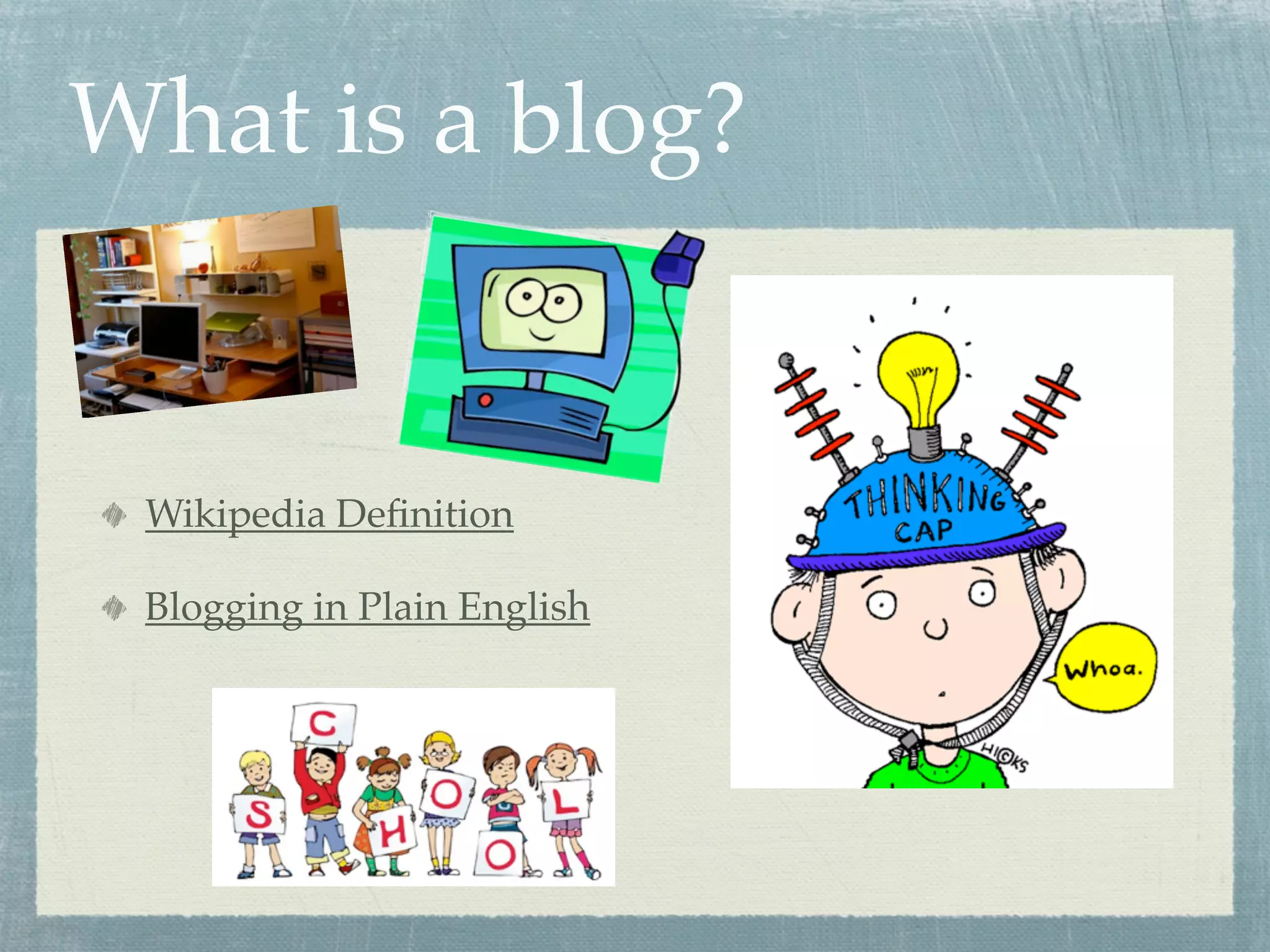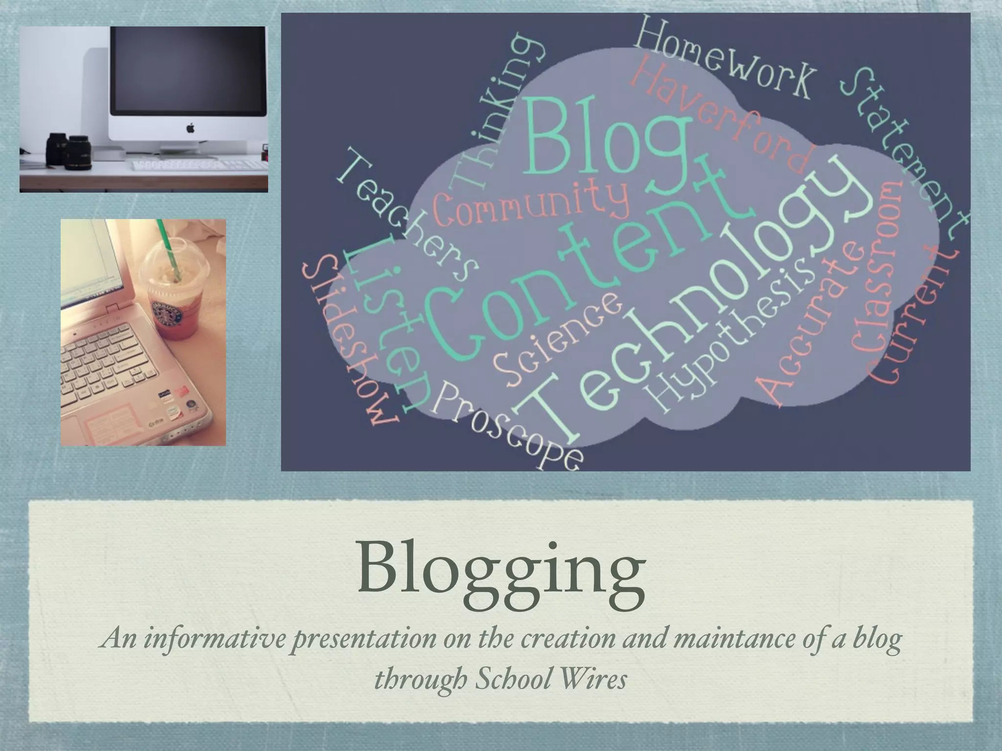 This document provides instructions for creating and maintaining a blog through the School Wires platform. It emphasizes that blogs should focus on educational content and not publish full student names. The key steps outlined are to log into School Wires, select eFaculty and your name, create a new page as a blog, name and save the page, and then use the general, posting, and comments tabs to configure and post to the blog. Some example topic ideas are also provided such as book clubs, current events, and science experiments. RSS feeds are also briefly explained as a way to syndicate and distribute blog content.