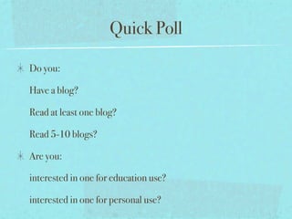 This document provides guidance on setting up and using blogs for educational purposes. It defines what a blog is, lists common blogging platforms like Blogger and Edublogs, and gives examples of education-focused blog topics. The document outlines key steps for getting started like creating an account, choosing a template, and publishing initial posts. It stresses the importance of safety for student blogs and moderating comments. The goal is to teach students proper online communication and involvement through blogging.