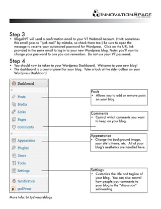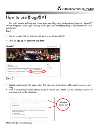 This document provides a 4-step tutorial for creating a blog using Blogs@VT: