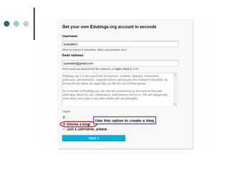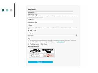 The document discusses the benefits of student blogging and how to set up blogs using Edublogs. Some key benefits mentioned are that blogging allows students to share their writing with a wider audience, helps improve critical thinking skills, and aligns with students' online lives outside of school. The document also provides step-by-step instructions for setting up free blogs through Edublogs, including choosing a username, blog title, privacy settings, and activating the account. Educators are encouraged to have students blog to help engage them in learning and develop 21st century communication skills.
