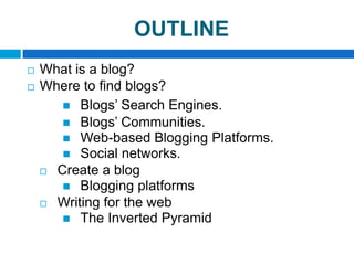 This document discusses blogging, including what a blog is, where to find blogs, how to create a blog, and how to write for the web. It defines a blog as a website usually maintained by an individual that displays posts in reverse-chronological order. It provides examples of places to find blogs, such as search engines, communities, platforms, and social networks. It also gives tips for creating a successful blog and discusses how writing for the web differs from traditional media by using a multi-dimensional structure rather than an inverted pyramid structure.
