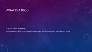 This document provides an introduction to blogging, including the history of blogging, key differences between blogs and websites/academic writing, recommendations for blog content and dos/don'ts for writing blogs. It outlines the basics of setting up a blog on the City University platform and publishing the first blog post.