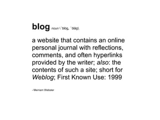 The document provides an overview of blogging basics and tips for starting a successful blog. It defines what a blog is and explores common reasons for blogging, such as sharing knowledge, connecting with others, and building a personal brand. It then lists 12 steps for starting a blog, including choosing a topic, targeting an audience, selecting a blogging platform, diving in and learning the platform's features, budgeting time, hoarding post ideas, keeping a notebook, creating a post calendar, writing good content, optimizing content for search engines, promoting posts on social media, and tracking traffic. The overall document serves as a guide for anyone looking to get started with blogging.