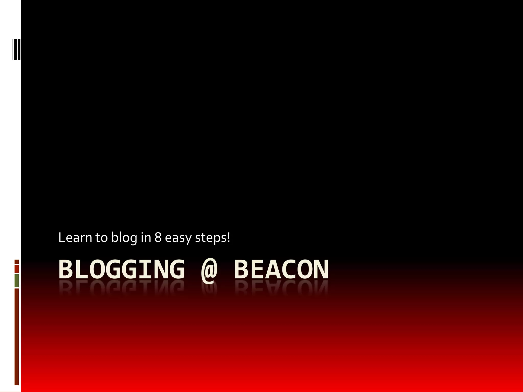 This document outlines 8 steps for learning how to blog on WordPress, including logging into your WordPress account, clicking "Dashboard" and "Add New" under "Posts", entering a title, writing about your blogging experience, uploading a picture, publishing the post, and commenting on another person's post. The overall goal is to teach the reader how to create and publish their first blog post in WordPress.