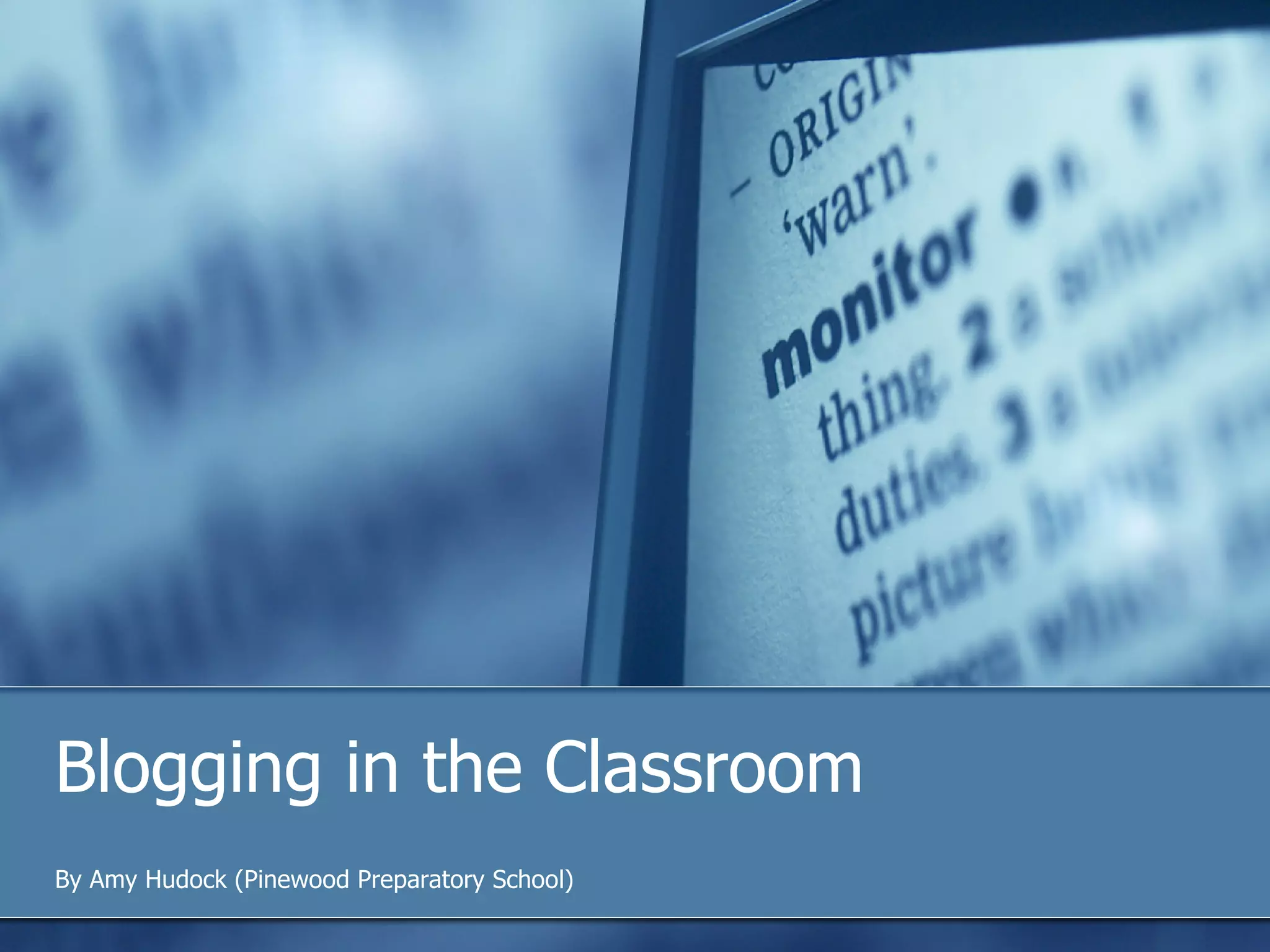 The document discusses using blogs in the classroom to enhance writing and engagement. It outlines how blogs can be used for class discussions, writing prompts, homework assignments, and student portfolios. Blogs allow students to publish writing, provide peer feedback, and develop internet skills while fostering a writing community. Research indicates blogging can improve writing by creating a comfortable online space for students to collaborate and receive feedback on work.