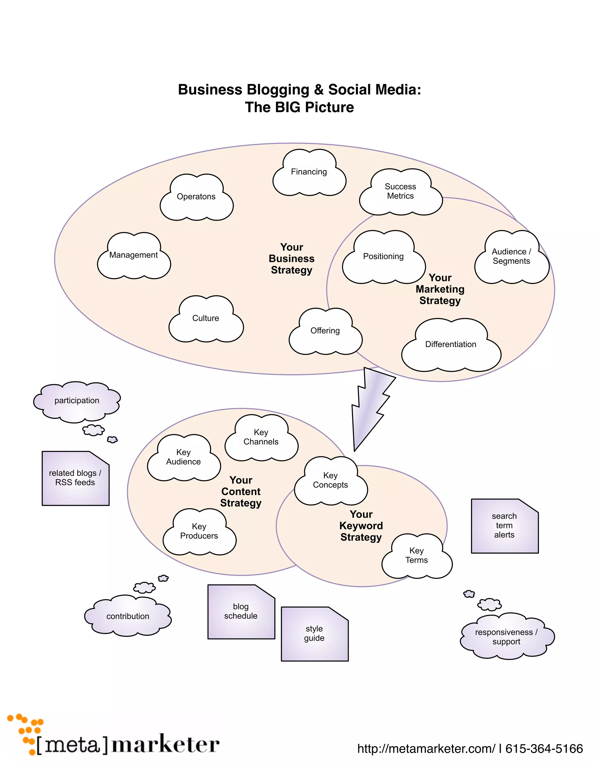 This document provides an overview of key considerations for business blogging and social media. It outlines various interconnected elements that must be addressed including operations, financing, metrics, culture, offering, differentiation, business strategy, marketing strategy, positioning, audience, content strategy, channels, producers, and terms. An effective approach requires determining strategies and plans for each of these elements.