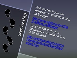The document discusses three types of blogs that can be used in language classes: tutor blogs run by the teacher to share course information, class blogs as a collaborative space for teachers and students, and learner blogs as individual student spaces. It provides guidance on starting a classroom blog, such as choosing an easy platform, teaching netiquette, keeping posts short, informing parents, using correct grammar, not grading blogs, challenging students, and giving the blog time to be effective. Potential uses of classroom blogs include providing reading practice, guiding students to resources, enhancing literacy and writing skills, encouraging shy students, stimulating discussion, creating an online portfolio, and building relationships between students.
