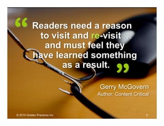 The document discusses the effectiveness of blogging as a lead generation tool, emphasizing the importance of providing readers with valuable content to encourage their return. It outlines the necessity for credibility and visibility to attract prospects and the significance of engaging content strategies. Additionally, it highlights the potential for blogging to establish one as a recognized authority in their niche while building relationships that lead to business opportunities.