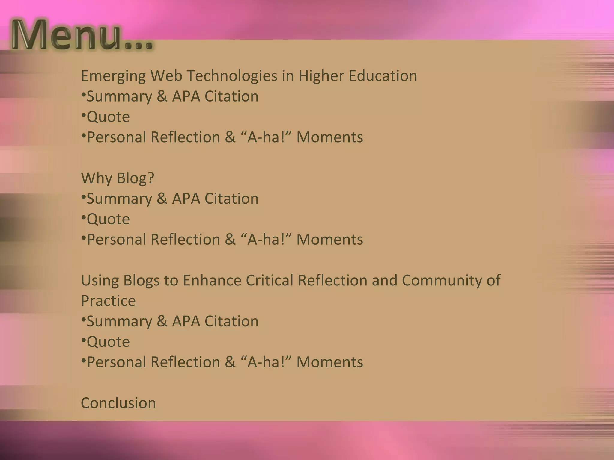 These articles discuss using blogs in education to enhance student learning and reflection, communicate with parents, and build communities of practice. Blogs allow students to write for authentic audiences, reflect on their learning, and receive feedback on language skills. Teachers can use blogs to share resources, stimulate discussion, and improve instruction through collaboration. When integrated according to student needs and learning styles, emerging technologies like blogs can positively impact the learning experience.