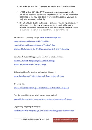 This document provides instructions for setting up and using a blog on Blogger.com. It explains how to create a Blogger account, choose a template and blog title, and add posts and other elements like headers, gadgets, links, and photos. Tips are included for common tasks like editing the header, writing posts, and setting up a class blog to allow students to publish posts. Related resources are also listed for integrating blogging into EFL teaching and creating video activities on teacher blogs.