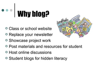 This document provides suggestions and tips for creating an educational blog, including sample blogs, how to set up a blog, organizing blog content, customizing the blog's appearance, adding multimedia elements, and optional extras. It recommends blogging to replace newsletters, showcase student work, host online discussions, and post class resources and materials. Links are included to sign up and get help setting up an educational blog.
