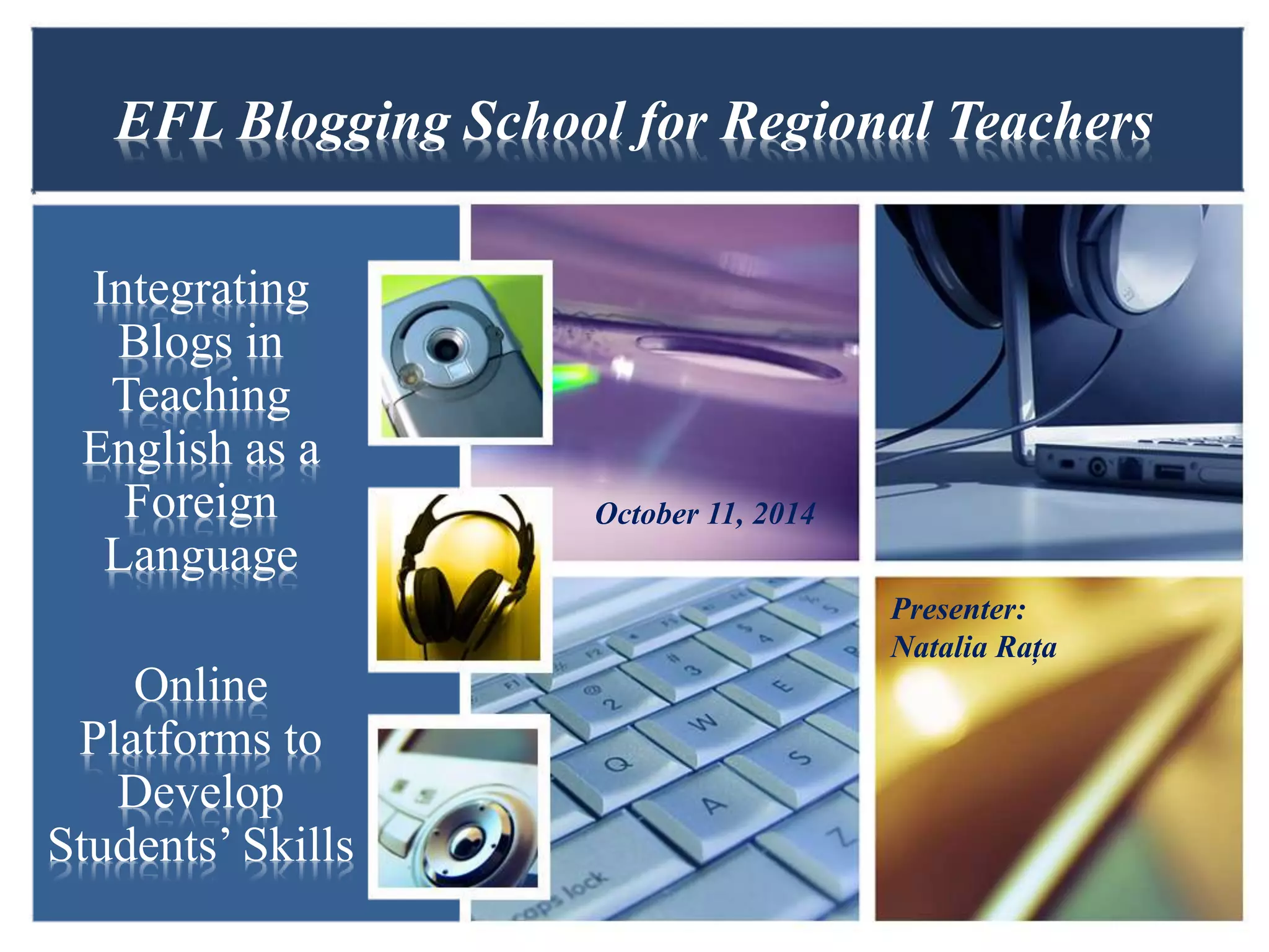 This document outlines an agenda for an EFL teacher workshop on integrating blogs into teaching. The workshop will cover online platforms for creating blogs, tools for video, writing, and graphic production, and turning blogs into teaching tools through daily integration, project-based learning, e-portfolios, and rubric-based evaluation. Teachers will learn strategies for developing students' 21st century skills like communication, collaboration, and problem solving through blogging activities. The workshop aims to help teachers efficiently integrate technology into the classroom as called for in the national education strategy.