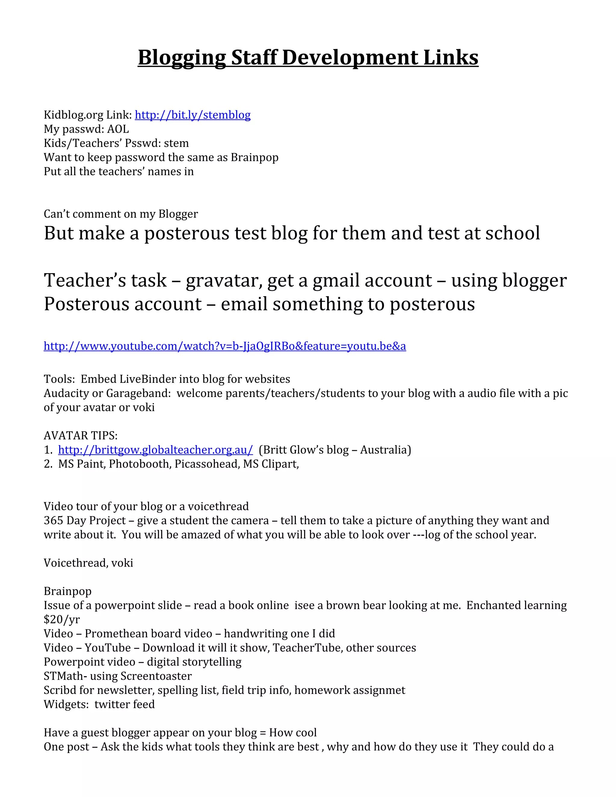 This document provides information about blog resources and tools for staff development. It lists the login information for a Kidblog account, recommends using Gravatar and Posterous for teachers' accounts, and suggests embedding LiveBinder, using Audacity/Garageband for audio, and creating avatars or video tours of blogs. It also offers ideas for student blogging projects like a 365 day photo journal. Recommended educational tools include Brainpop, Voicethread, and video/screencasting options. Top blogs and bloggers in education are recognized.