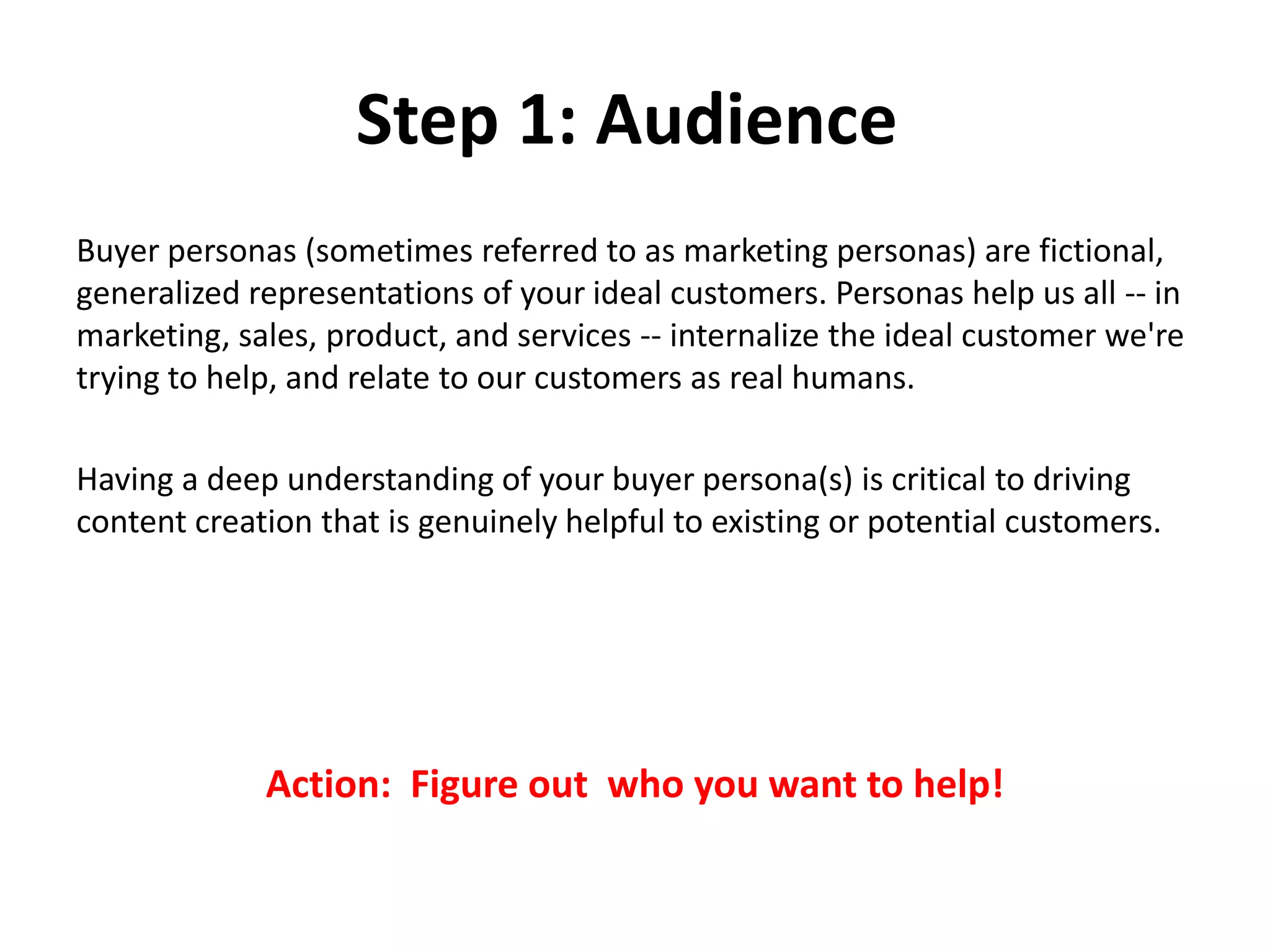 This document outlines the 9 steps to take when creating a blog post, including defining your audience, determining the main point, brainstorming content from personal experiences, structuring the post with headings and paragraphs, including a clear call to action, adding internal links to other related content, editing for clarity, ensuring the appropriate length, and including an image. The goal is to generate helpful content for readers by internalizing their perspective and sharing a unique personal viewpoint on a focused topic.