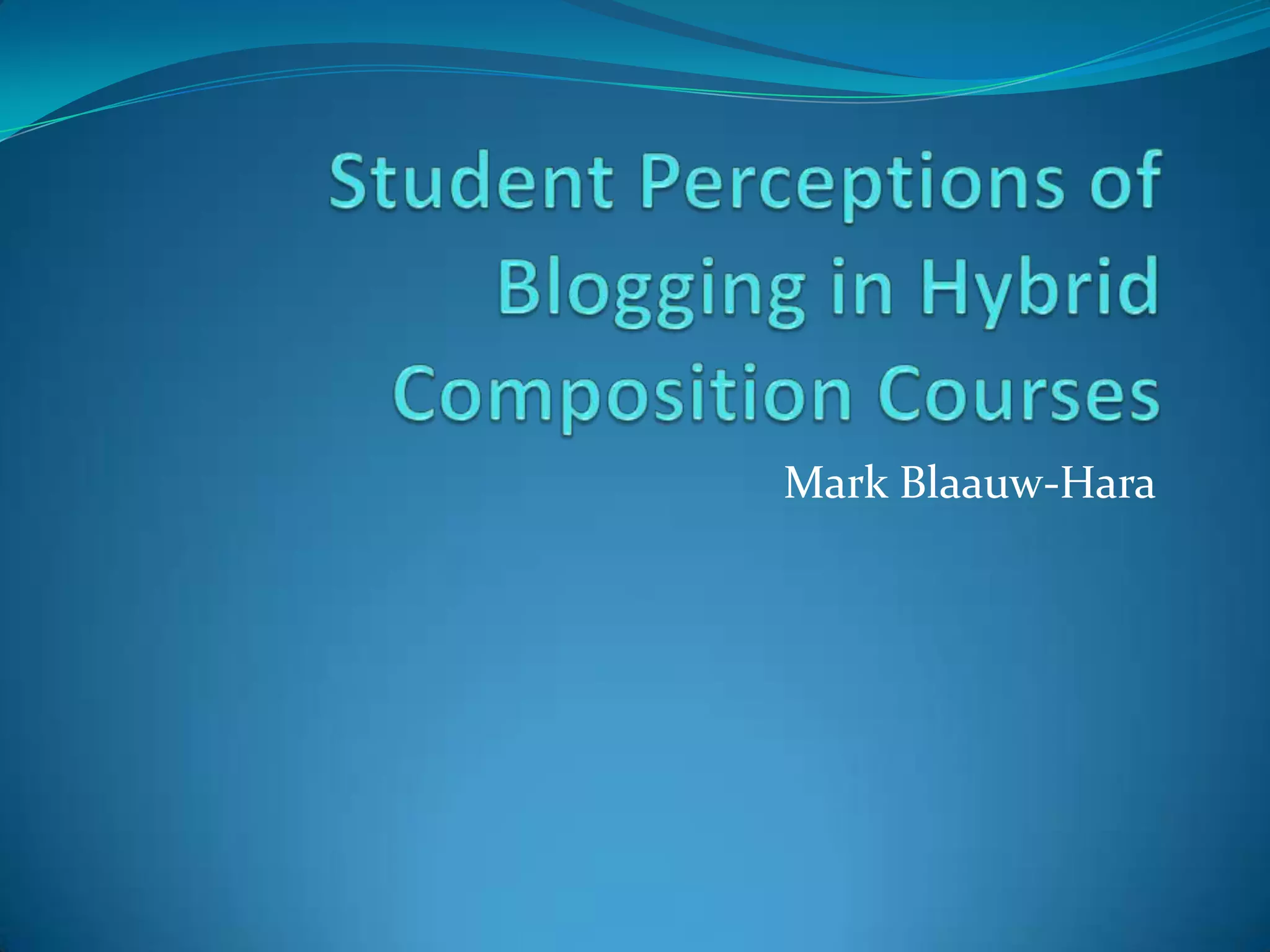 This document summarizes a study on student perceptions of blogging in two hybrid composition courses. The courses met once a week and included significant out-of-class reading, drafting, and blogging. A survey found that while students were comfortable with the hybrid structure, interest in the blogging decreased over time. Students wanted more specific blogging assignments, clearer grading, and more interaction. The author concludes that blogging has potential but needs changes like examples, feedback, and assignments requiring online discussion to increase success.
