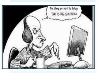 The document introduces blogging and its uses for student learning. It defines what a blog is, describes different types of blogs, and discusses why students should blog. It provides examples of how blogs can be used in various classroom subjects and encourages teaching students proper blogging skills and expectations. The document also explores blogging website platforms and provides examples of classroom blogs to inspire further blogging possibilities.