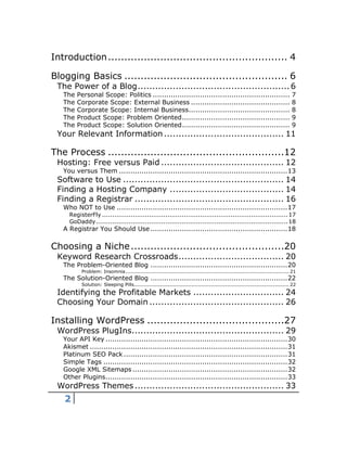 The document is a comprehensive guide on blogging, detailing the essential steps to create and manage a successful blog. It covers various topics including hosting options, software selection, niche identification, content creation, and traffic generation strategies. The text emphasizes the importance of understanding the blogging landscape and offers practical advice for both beginners and advanced bloggers.