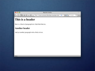 The document provides an introduction to CSS and how it works with HTML to control the presentation and styling of web page content. It explains basic CSS concepts like selectors, properties and values, and how CSS rules are used to target specific HTML elements and style them. Examples are given of common CSS properties and selectors and how they can be used to style elements and format the layout of web pages.